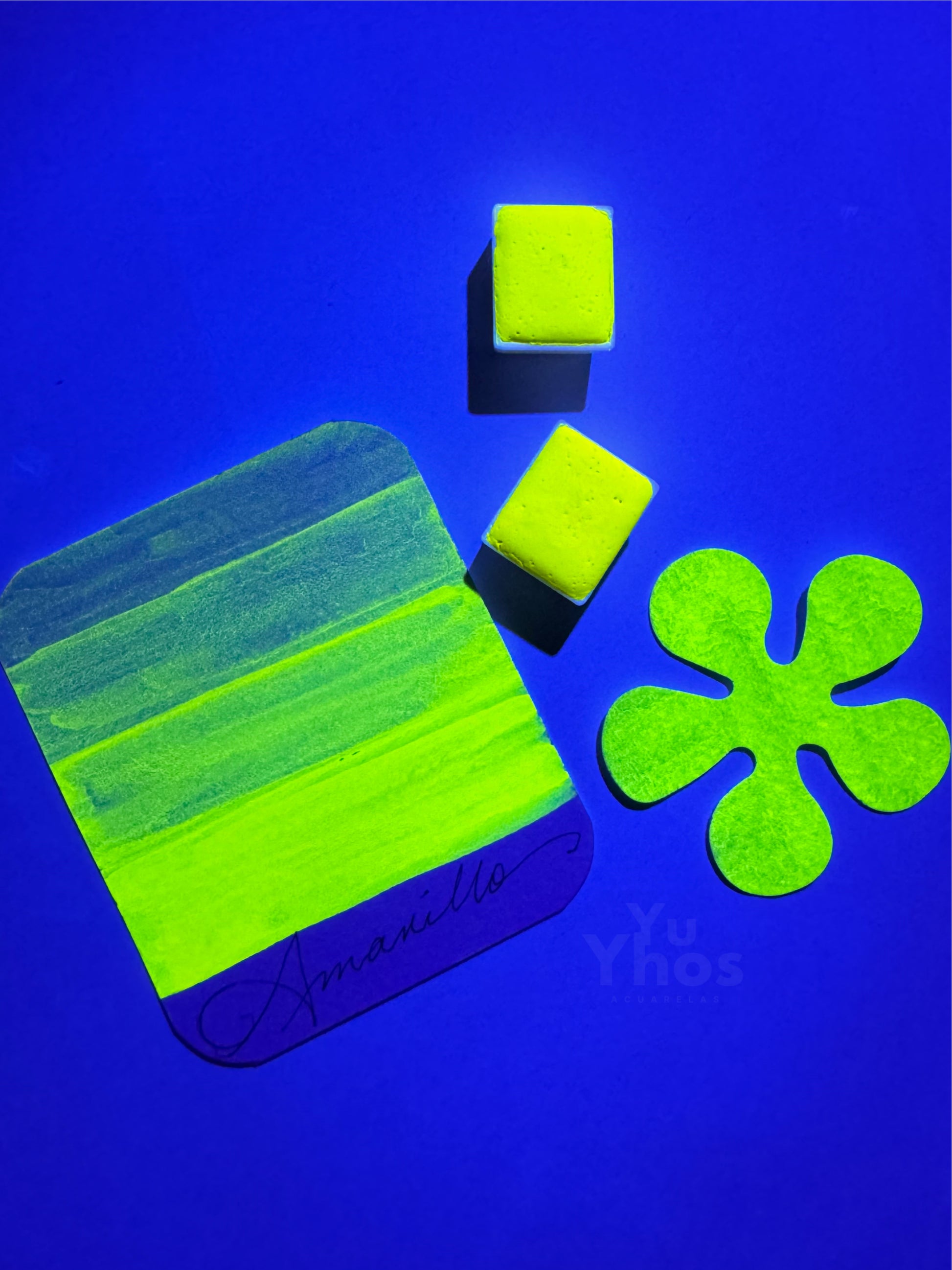 Amarillo Flúor es un amarillo neón muy intenso, perfecto para dar toques brillantes, contrastes fuertes y detalles que atraen la vista de inmediato. En el papel destaca con fuerza, y bajo luz UV, brilla intensamente en la oscuridad, creando un efecto visual impactante.