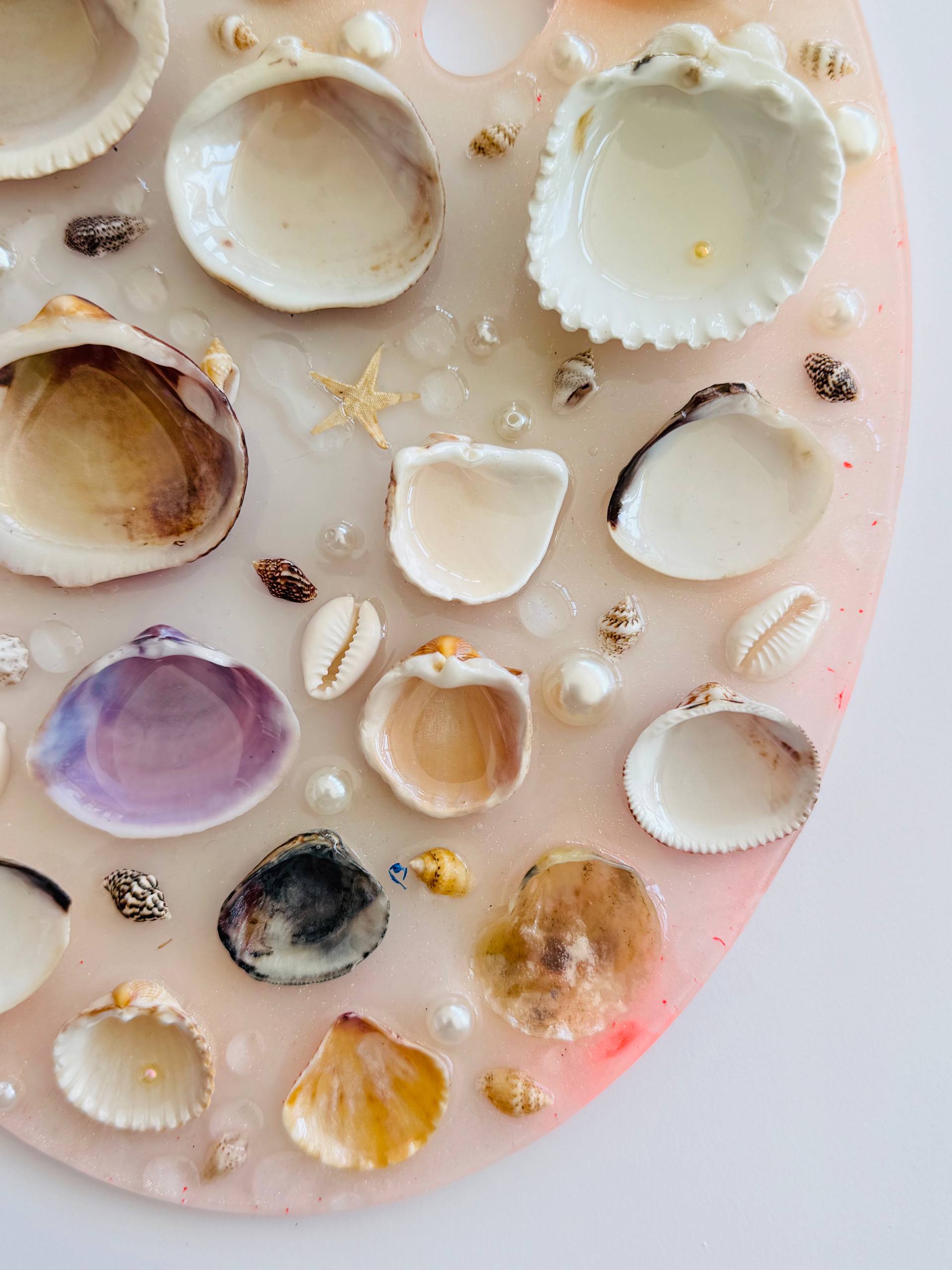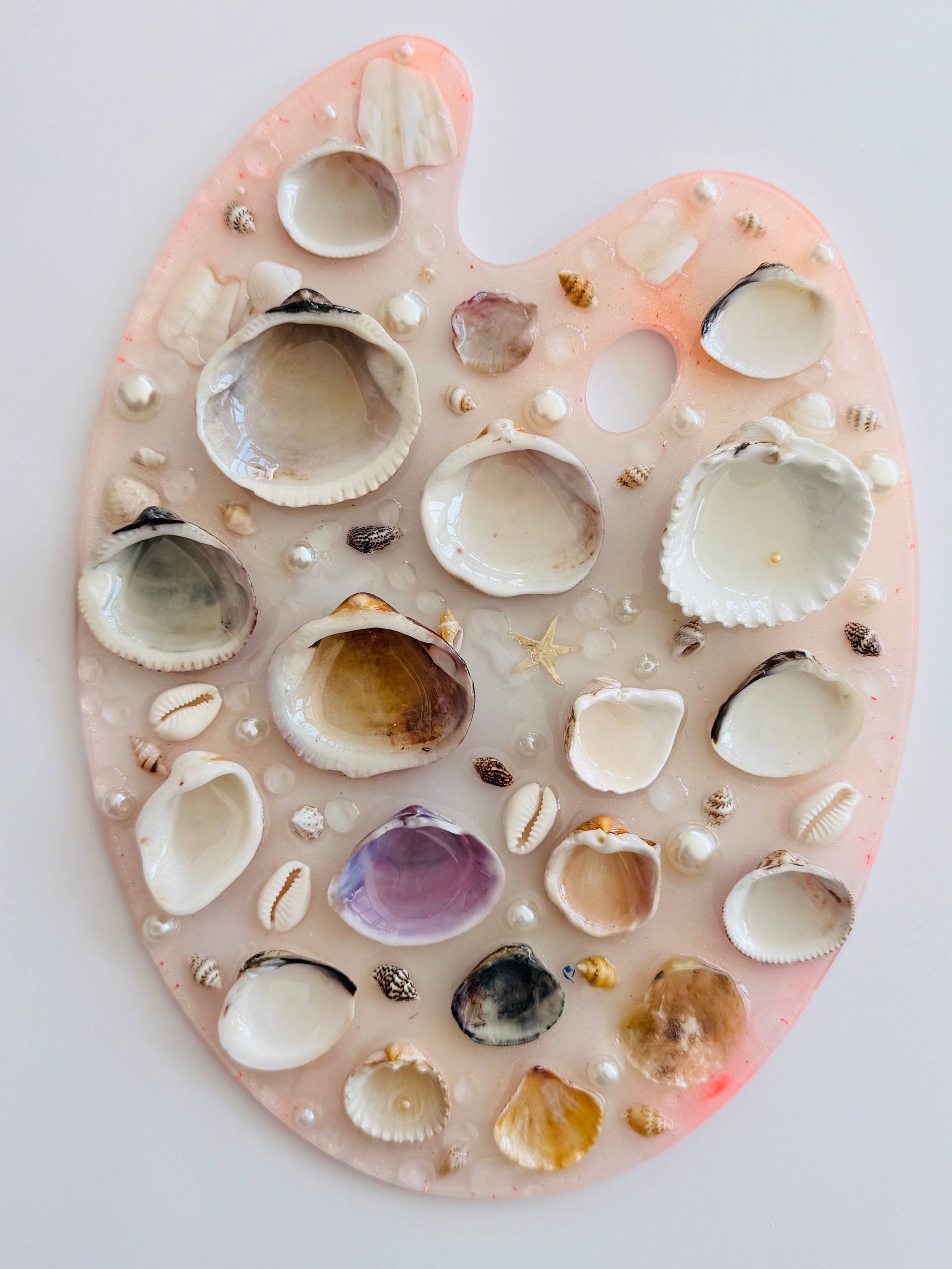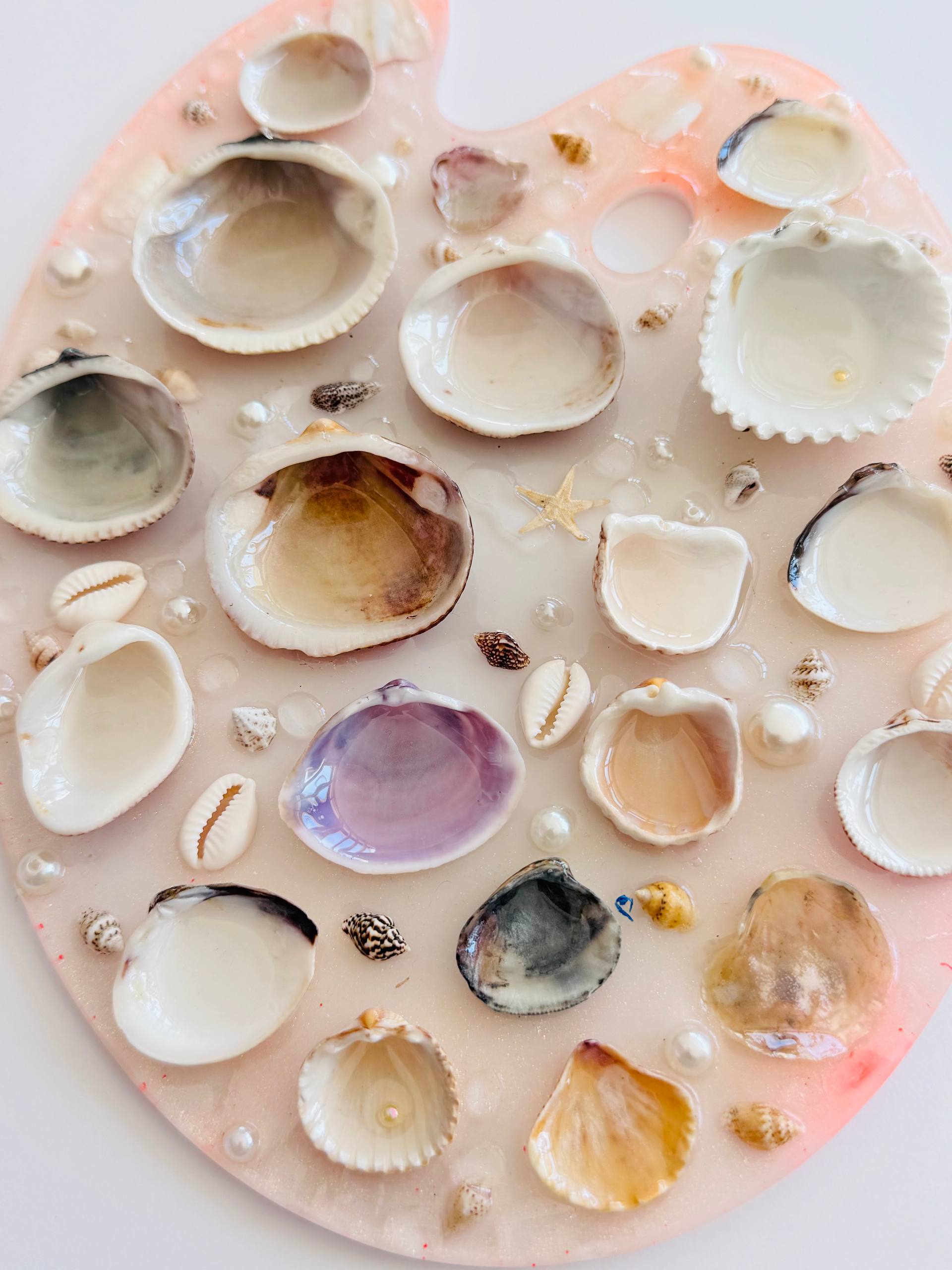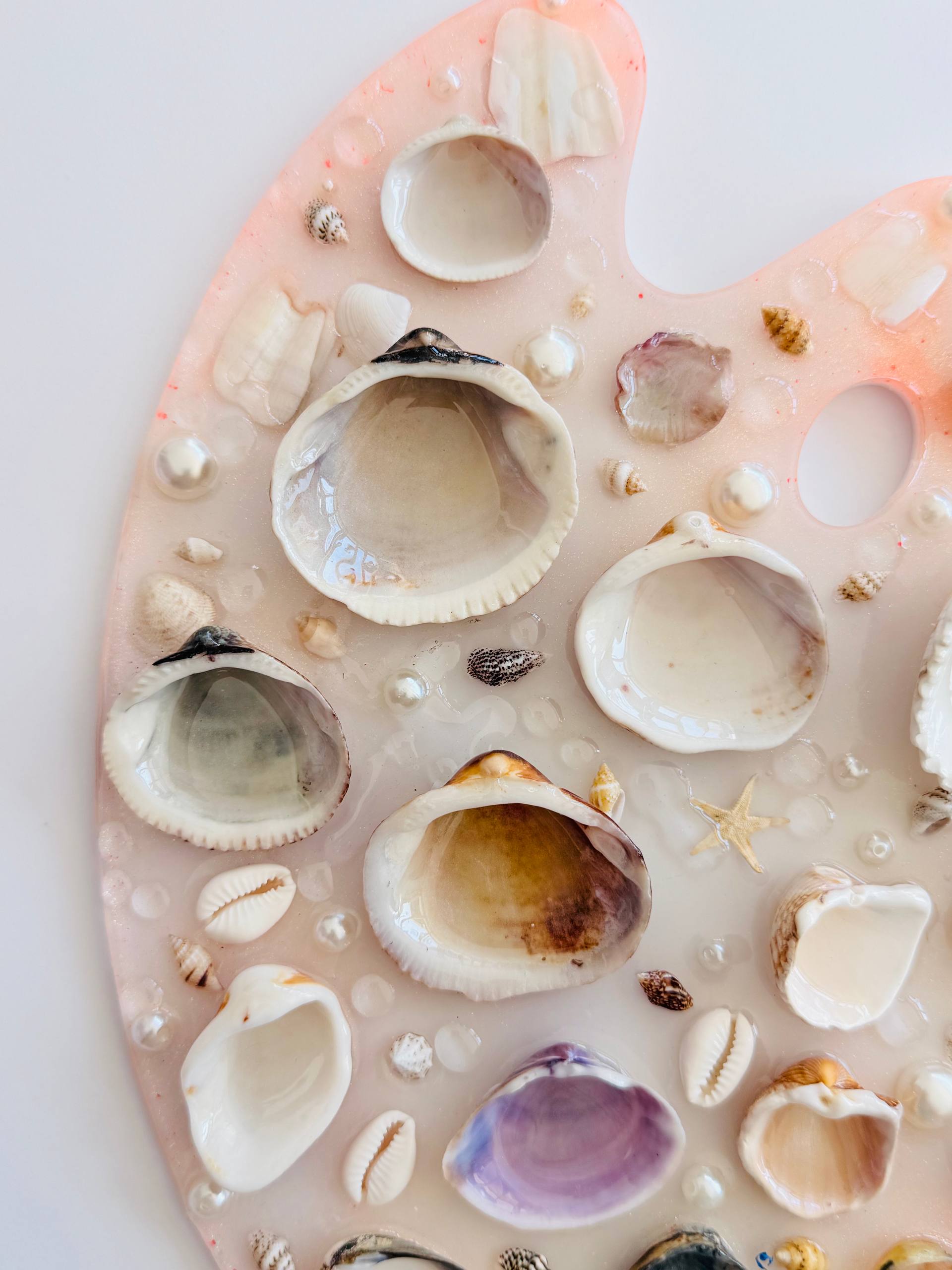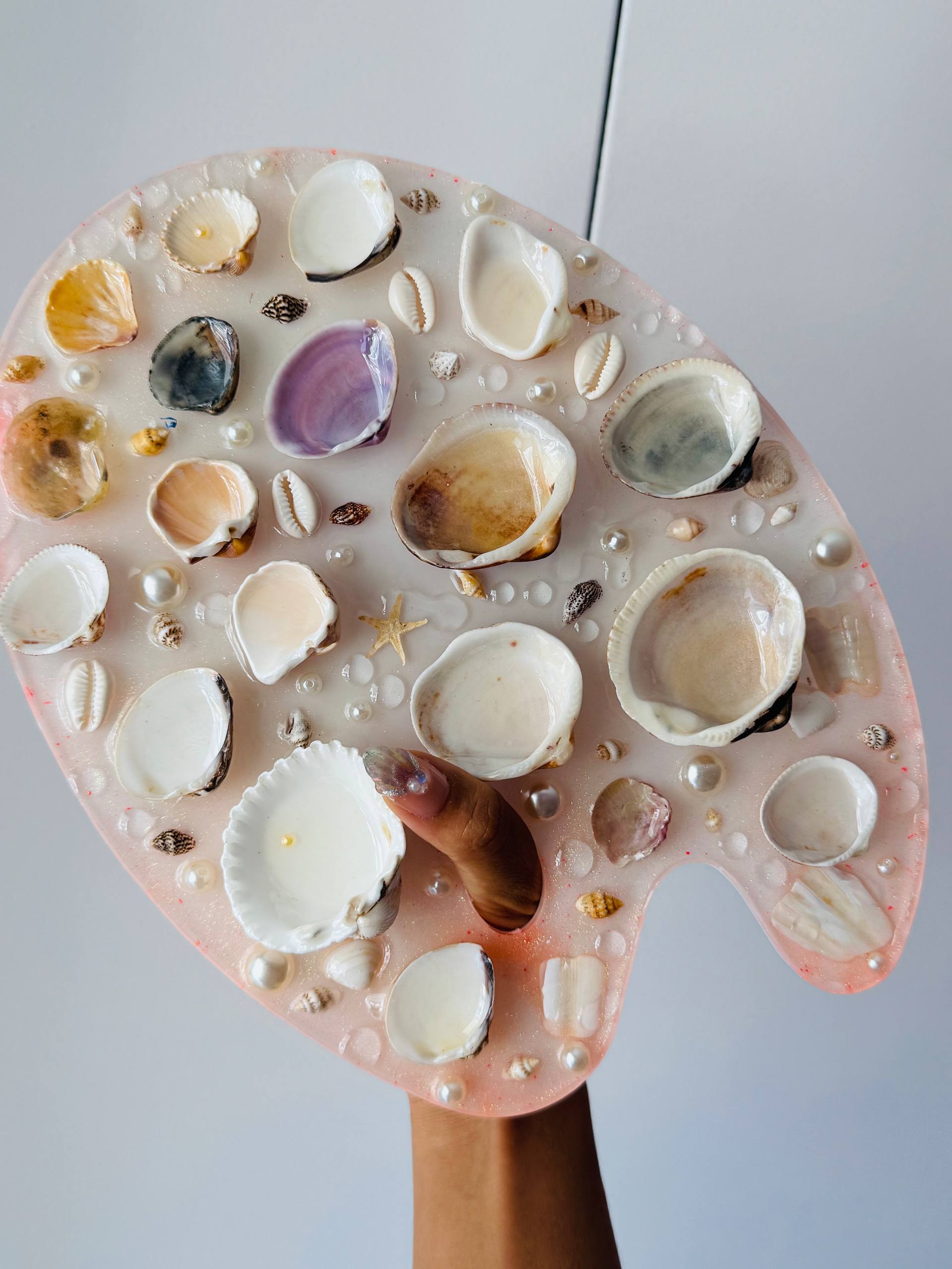 Esta pieza combina resina epoxi de alta calidad y conchas recicladas, transformadas con cuidado en una herramienta única para artistas. Lo que antes iba a ser desecho ahora se convierte en inspiración, una pieza que celebra la creatividad y nos permite aportar color y alegría al mundo a través del arte.