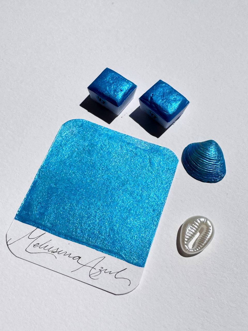 Melusina Azul es un tono metalizado precioso, con un acabado brillante que aporta frescura y un toque vivo a tus pinturas. Tiene muy buena cobertura y funciona muy bien sobre papel, cartón, madera, piedras y otras superficies absorbentes, lo que lo hace ideal para distintos proyectos creativos. Forma parte del set Sirena, una colección creada para quienes disfrutan de colores vibrantes, luminosos y llenos de personalidad.