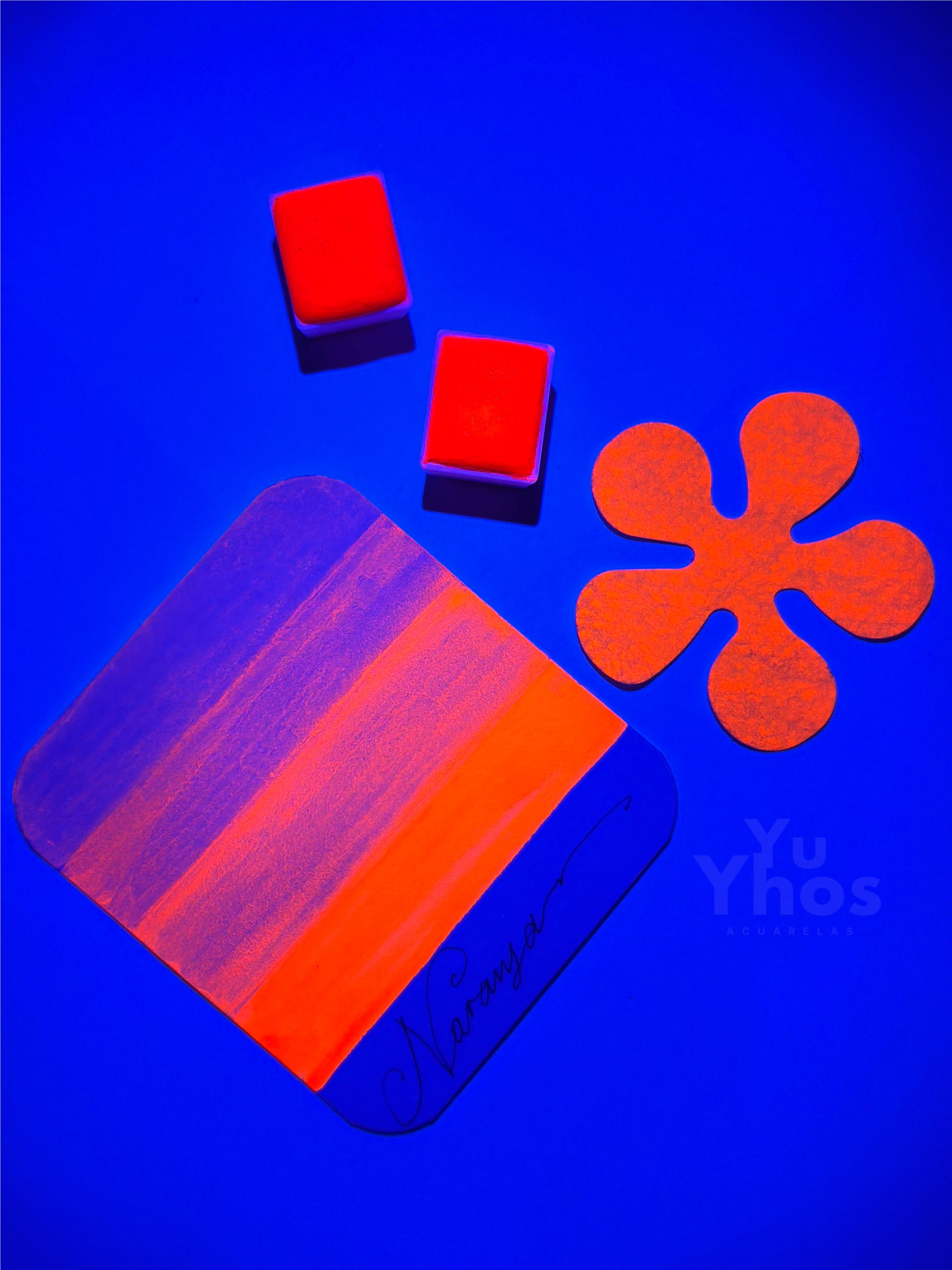 Naranja Flúor es un naranja neón muy brillante, ideal para crear contrastes fuertes, detalles llamativos y efectos que se notan a simple vista. Su color intenso resalta con fuerza sobre el papel y, bajo luz UV, brilla en la oscuridad, aportando un efecto sorprendente.