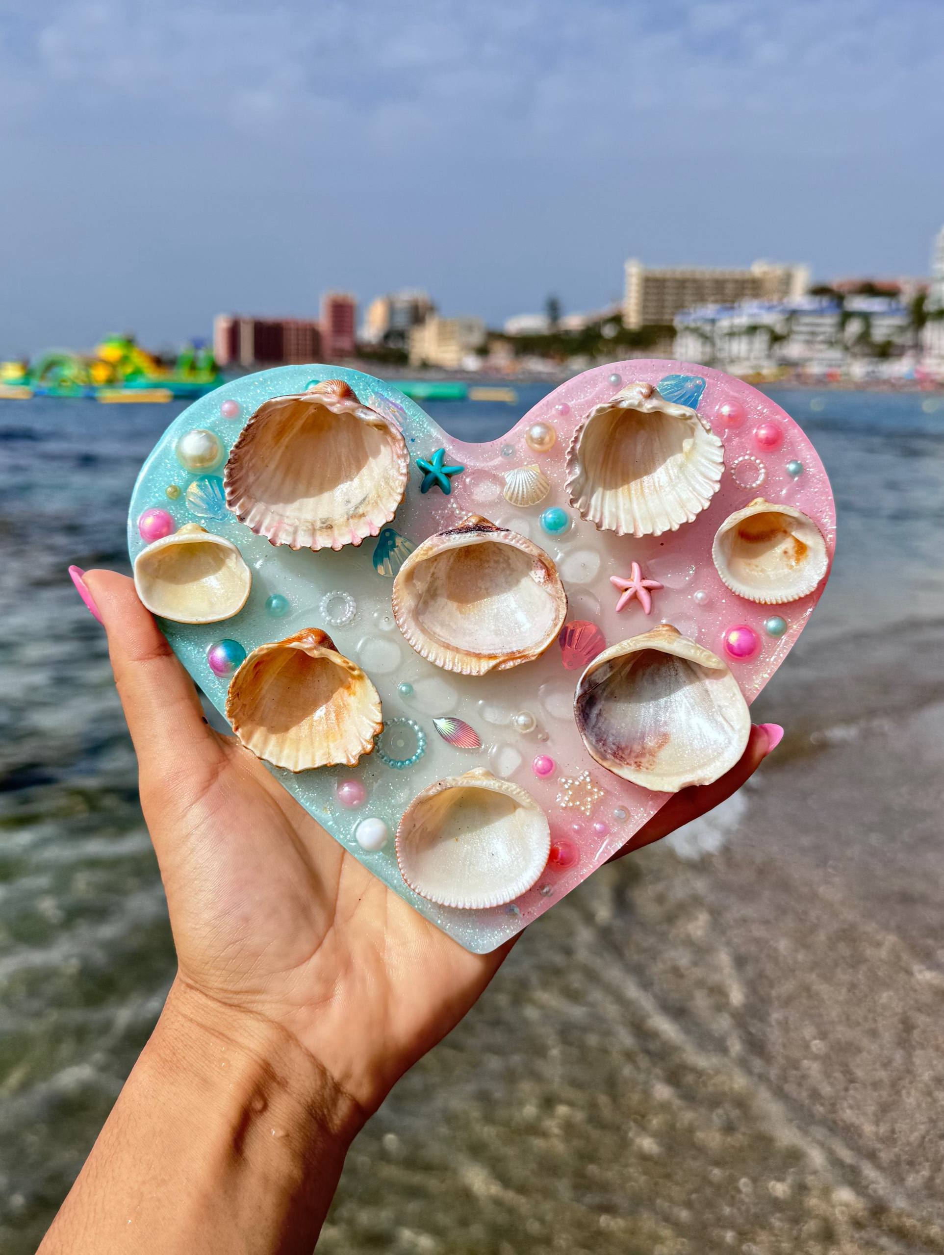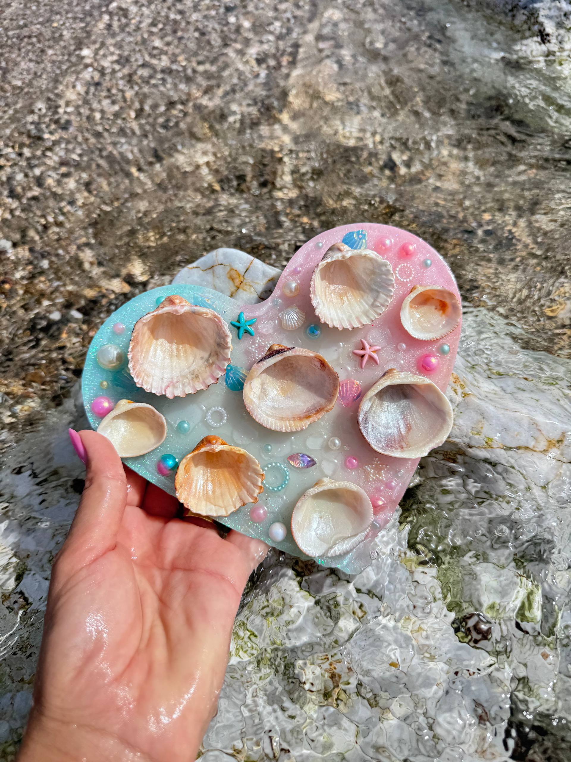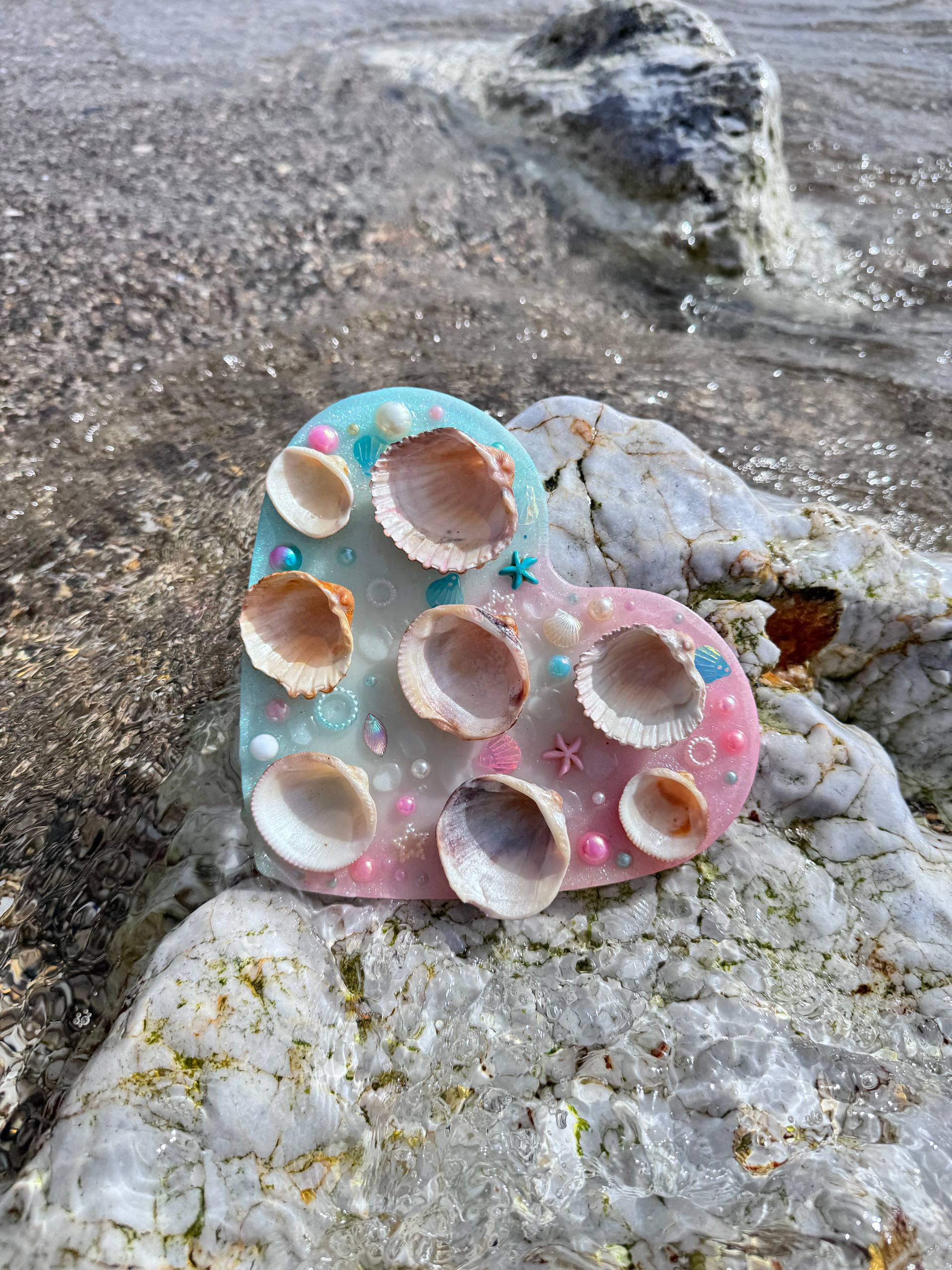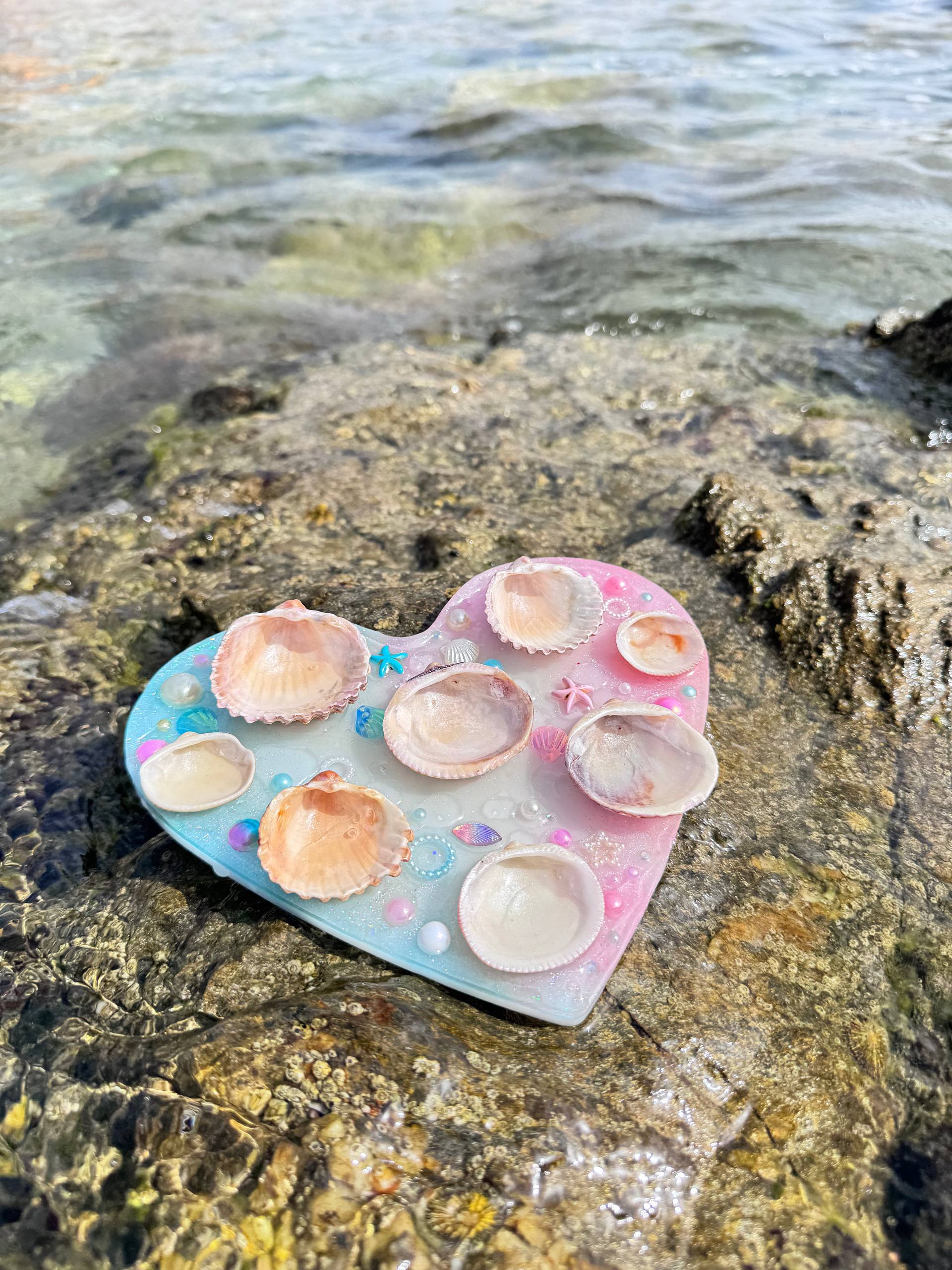 Esta pieza combina resina epoxi de alta calidad y conchas recicladas, transformadas con cuidado en una herramienta única para artistas. Lo que antes iba a ser desecho ahora se convierte en inspiración, una pieza que celebra la creatividad y nos permite aportar color y alegría al mundo a través del arte.