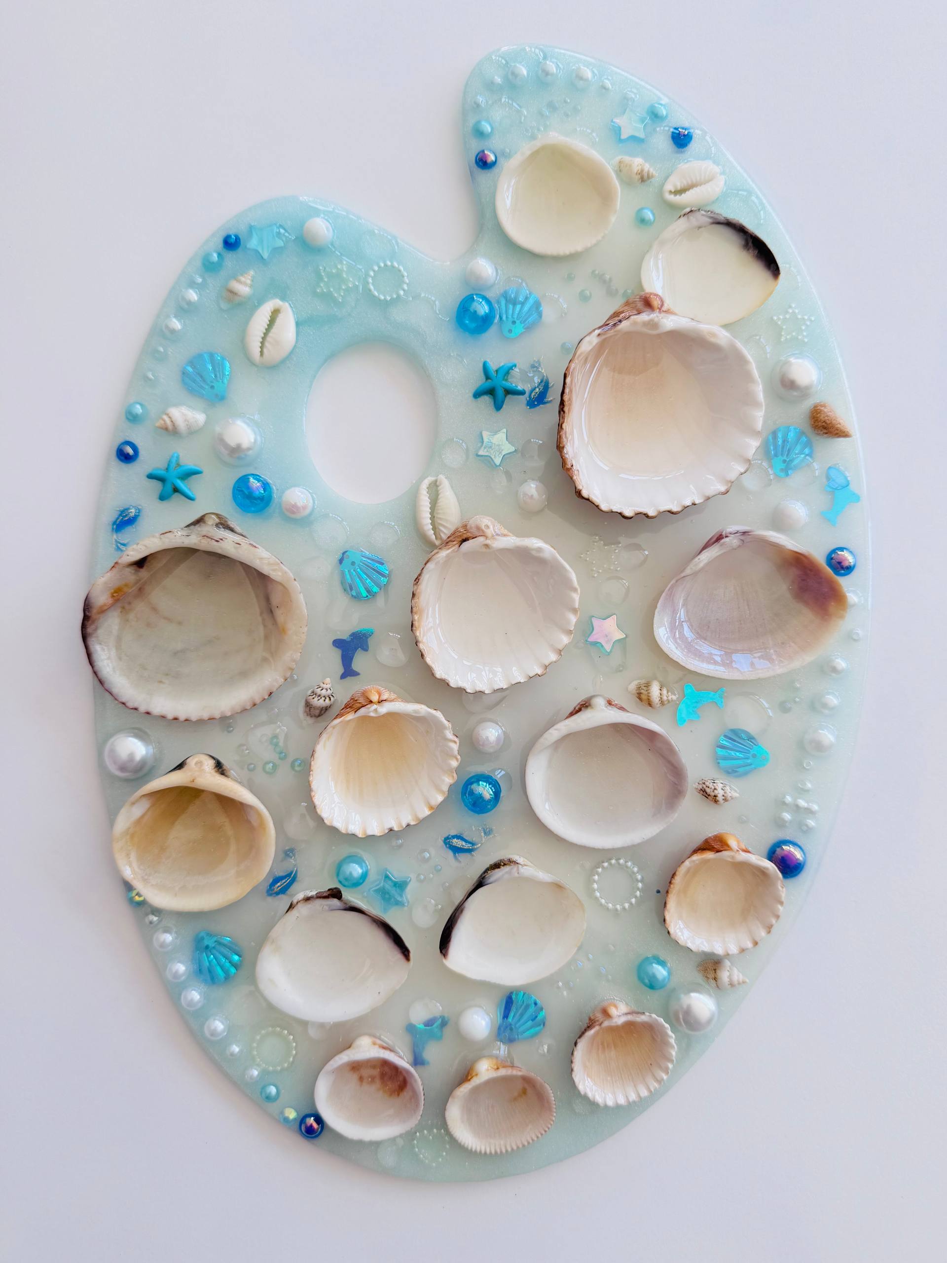 Esta pieza combina resina epoxi de alta calidad y conchas recicladas, transformadas con cuidado en una herramienta única para artistas. Lo que antes iba a ser desecho ahora se convierte en inspiración, una pieza que celebra la creatividad y nos permite aportar color y alegría al mundo a través del arte.