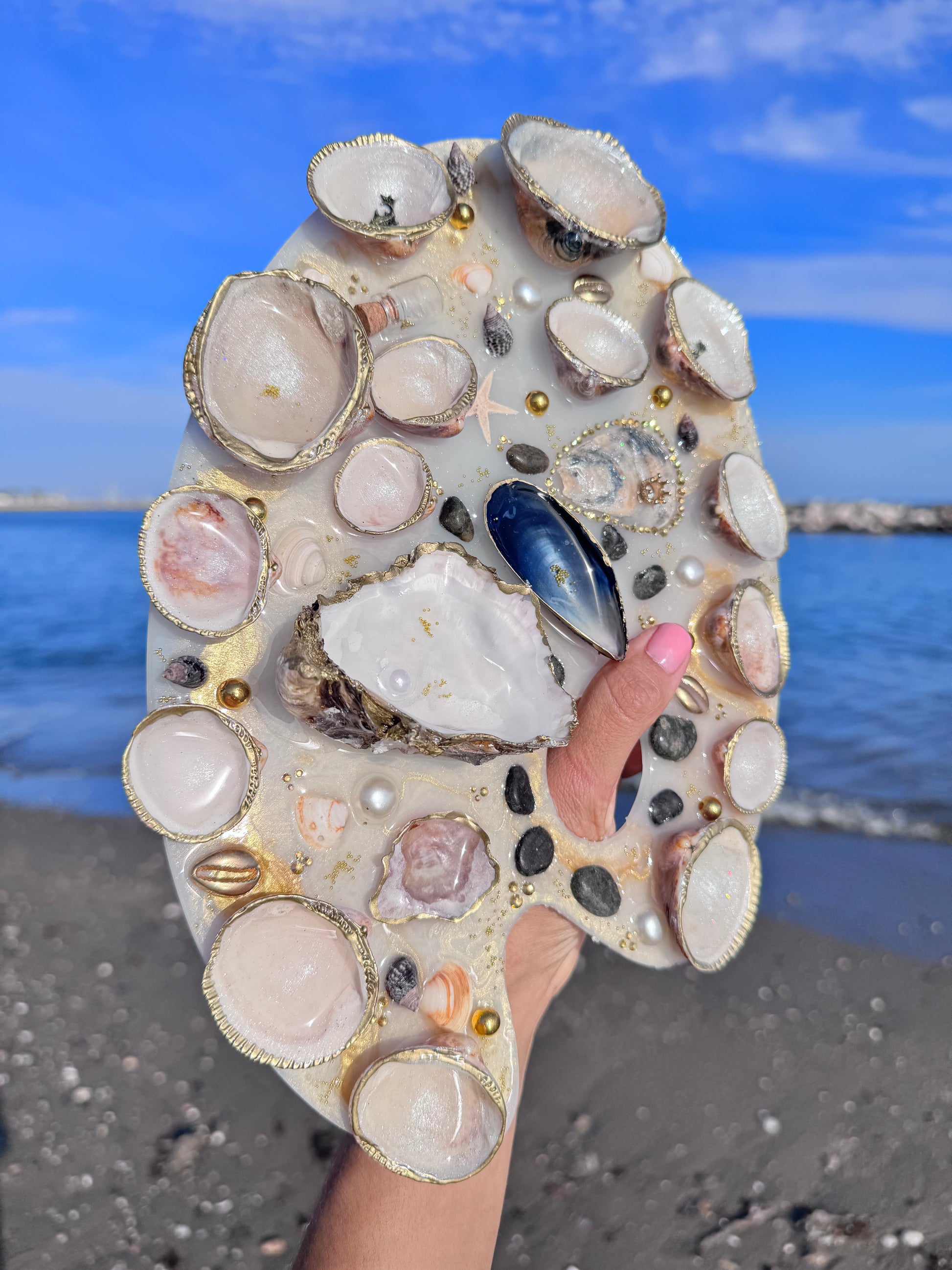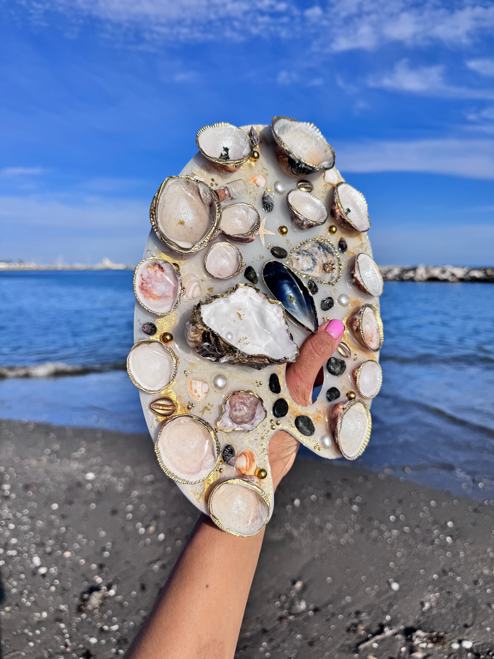 Esta paleta está elaborada con dedicación y cuidado, pensada para acompañarte en tu proceso creativo. Cada pieza es un modelo único e irrepetible: no existen dos iguales. Para crearla, transformo conchas recicladas 🐚 en una herramienta artística especial.