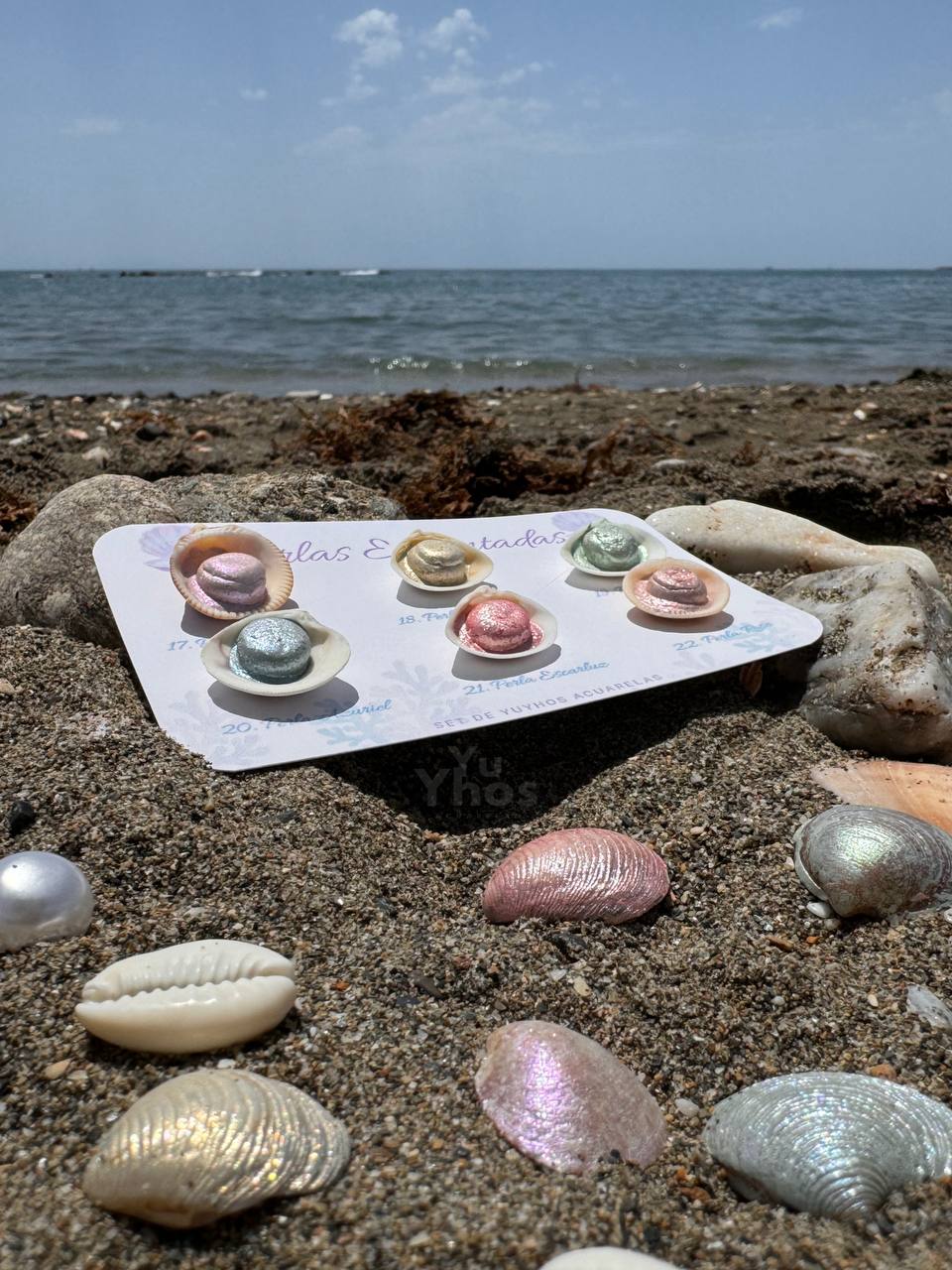 Cada acuarela está moldeada a mano sobre conchas de mar reales recicladas, lo que convierte a cada unidad en una pieza única, artesanal y preciosa.