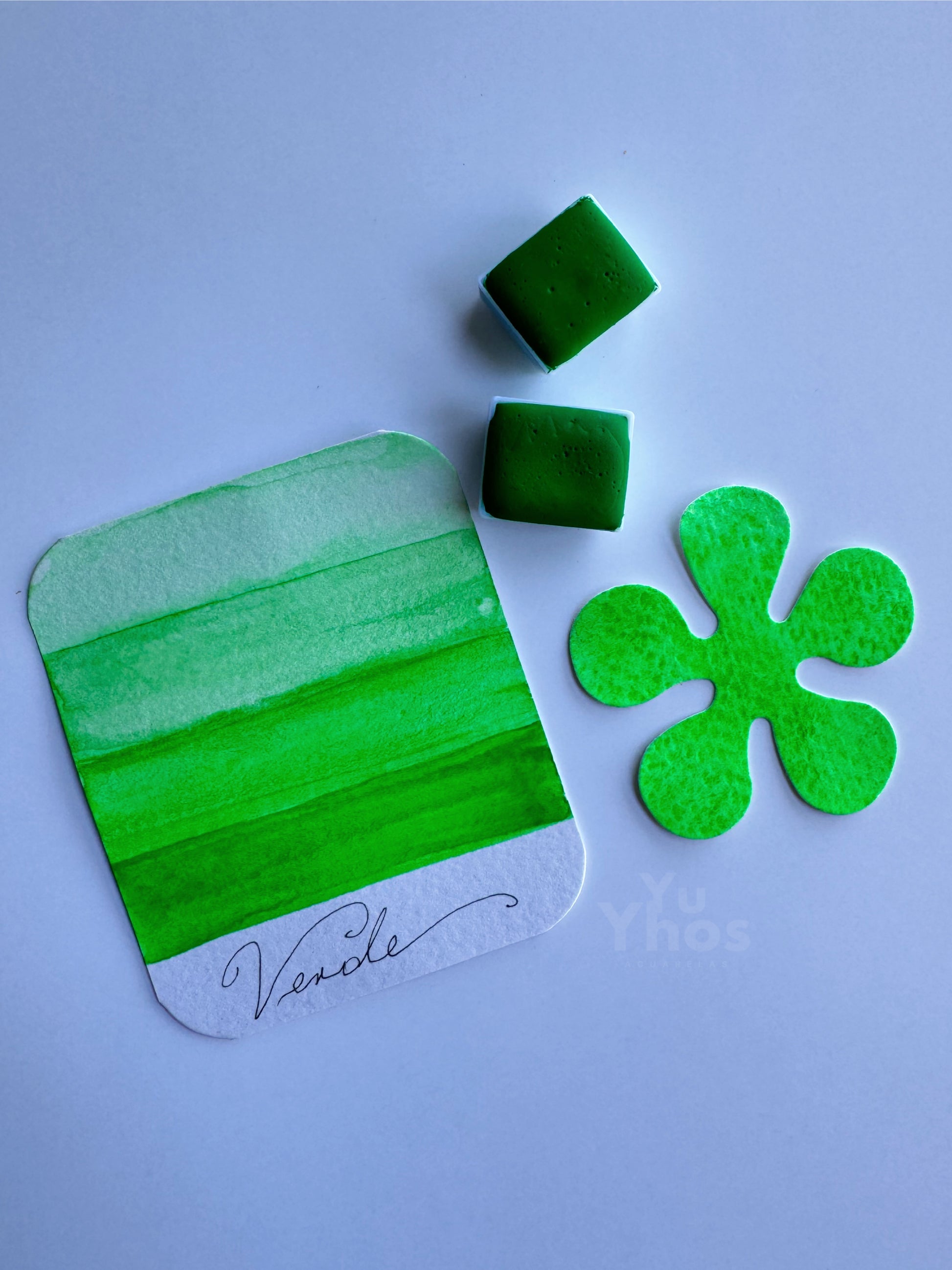 Verde Flúor es un verde neón muy brillante, ideal para acentos llamativos, contrastes marcados y efectos fuera de lo común. Su color destaca con fuerza sobre el papel y, bajo luz UV, brilla sutilmente en la oscuridad, aportando un toque especial a tus obras.